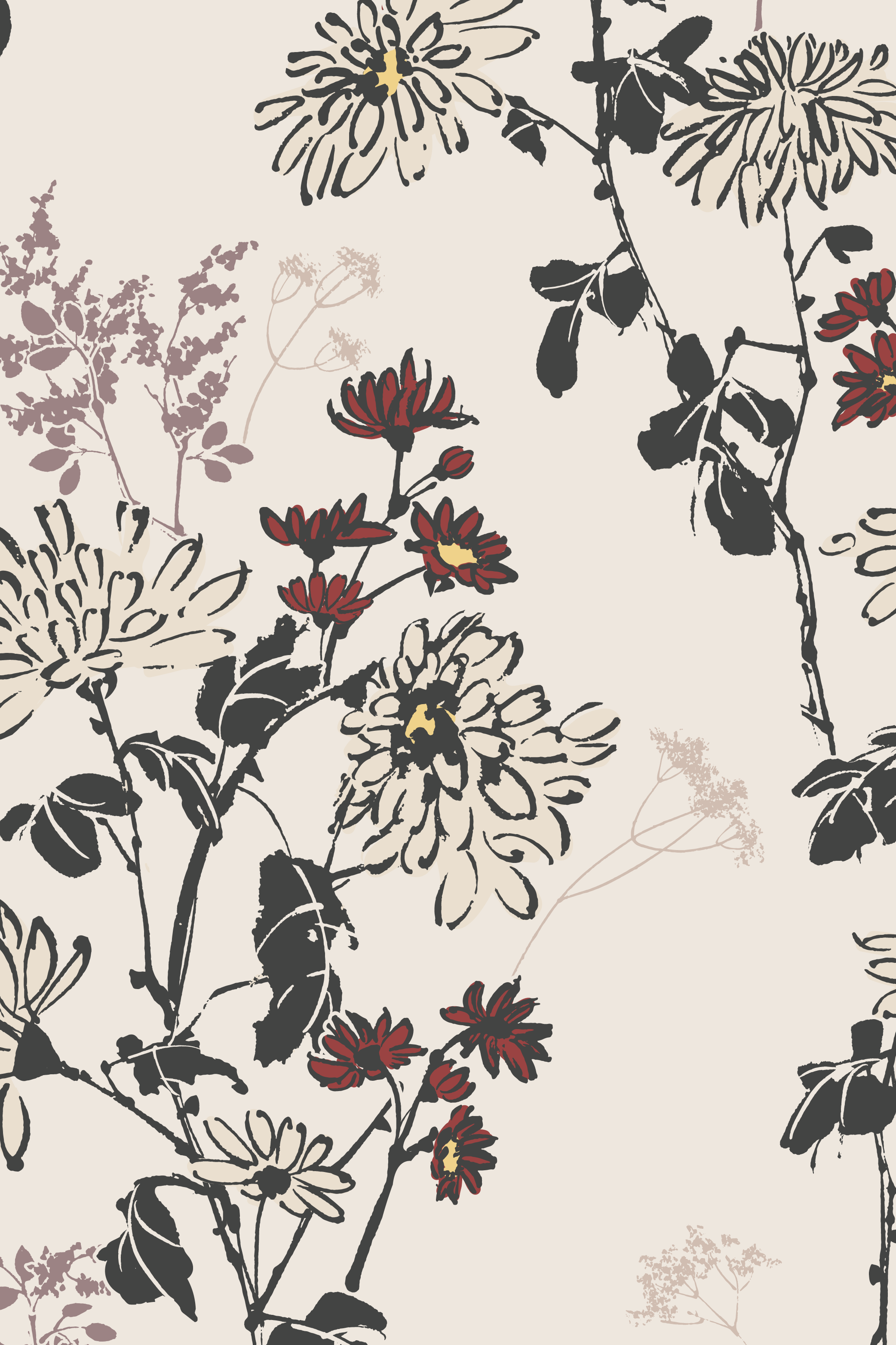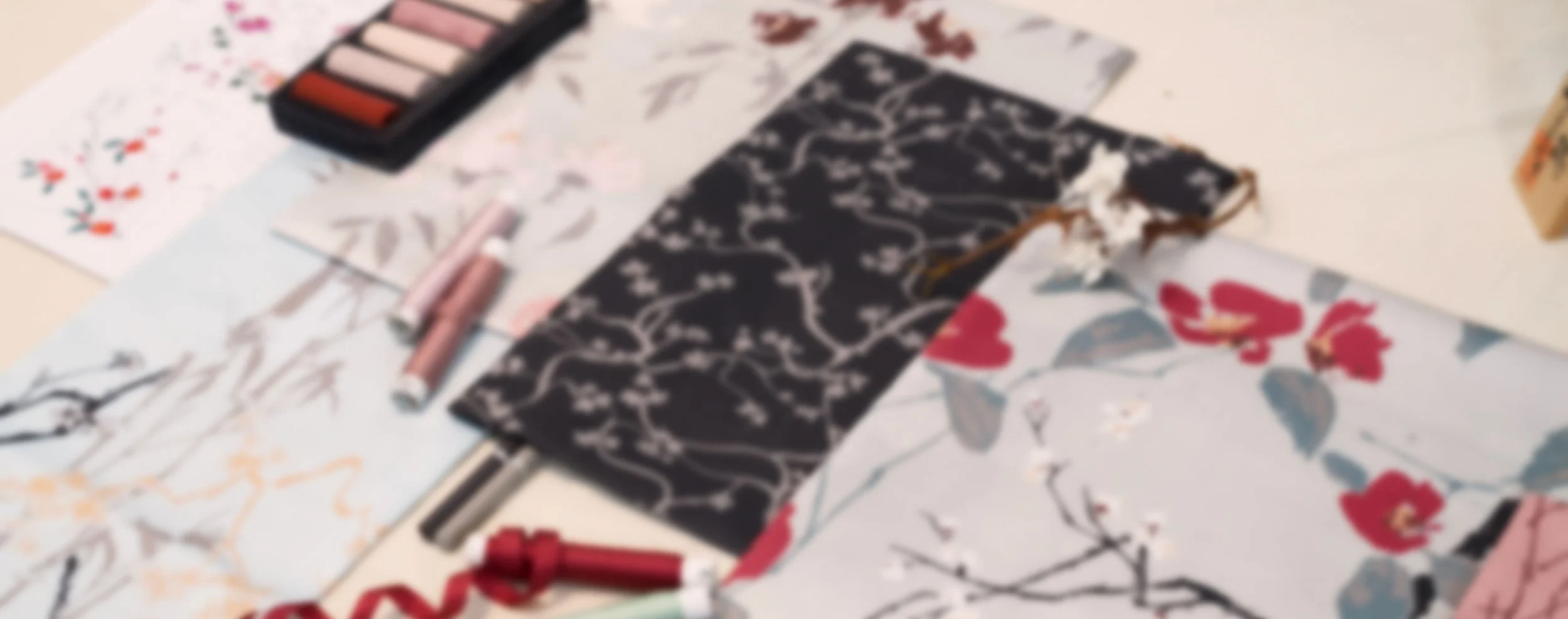 A collection inspired by quiet walks through temple gardens, the scent of moss, and the golden hush of Kyoto in late autumn. Chrysanthemums, pampas grass, persimmon, and maple leaves unfold across layered patterns and soft palettes, echoing the stillness of seasonal change. Rooted in Japanese aesthetics and shaped by personal experience, this series captures a fleeting beauty that lingers.